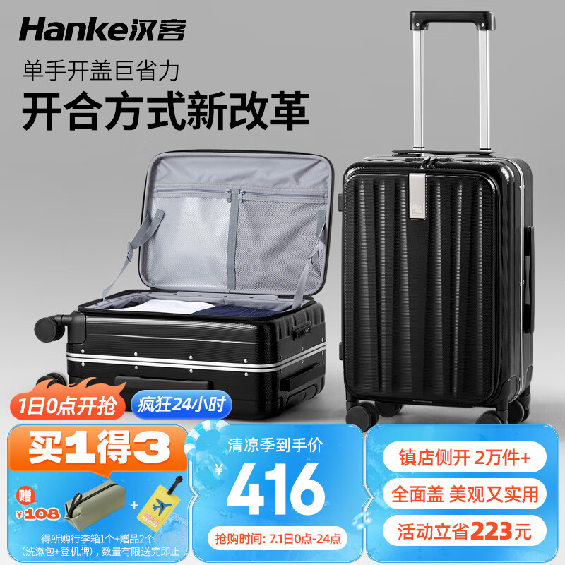 汉客行李箱男拉杆箱女登机旅行箱20英寸墨玉黑密码箱镇店前侧开盖铝框价格:639.00元!