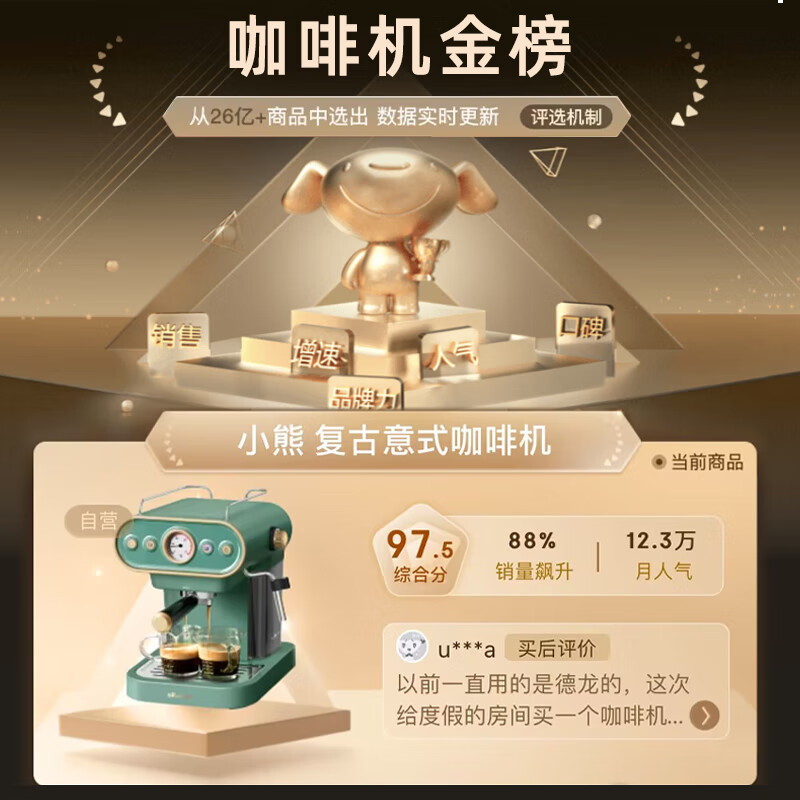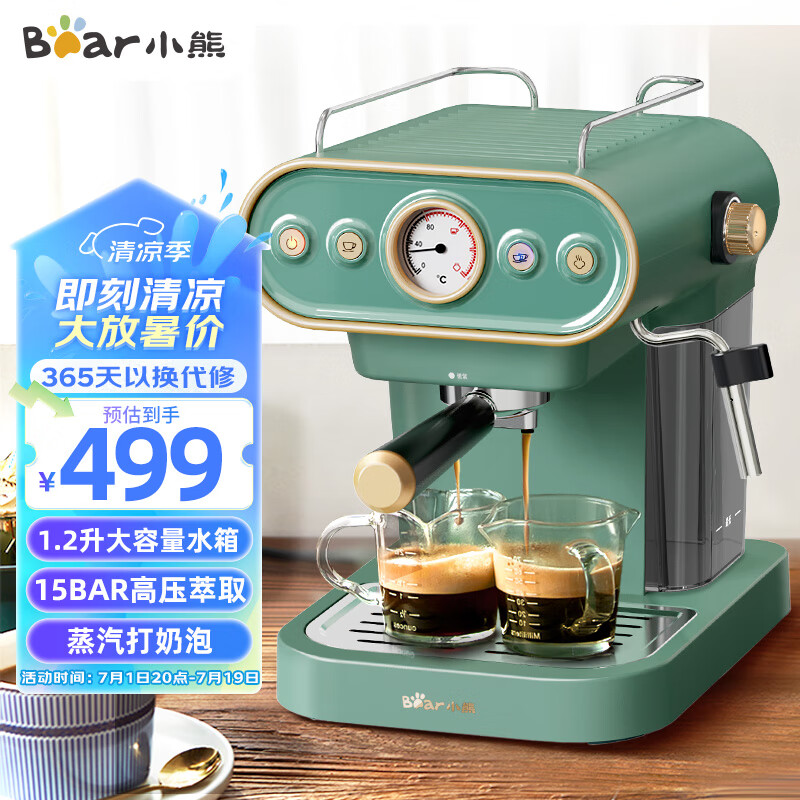 小熊(Bear)咖啡机家用复古意式泵压式15Bar高压喷射可打奶泡1.2升大容量水箱KFJ-B12X1端午送礼价格:599.00元!