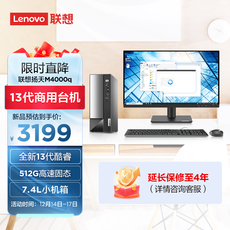 联想(Lenovo)扬天M4000q 英特尔酷睿i3 商用办公台式机电脑主机(13代i3-13100 16G 512G SSD Win11)21.45英寸价格:3199.00元!