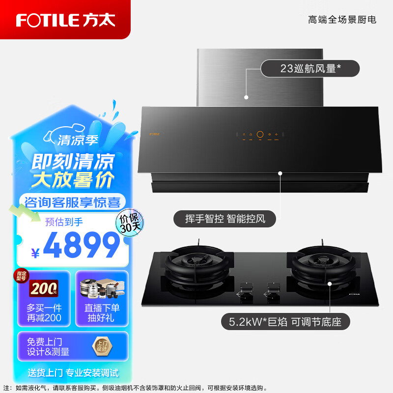 方太(FOTILE)抽吸油烟机灶具套装侧吸式变频烟灶23风量创新空气舱5.2kW*换装灶JCD10TA+01-TE23天然气价格:4899.00元!