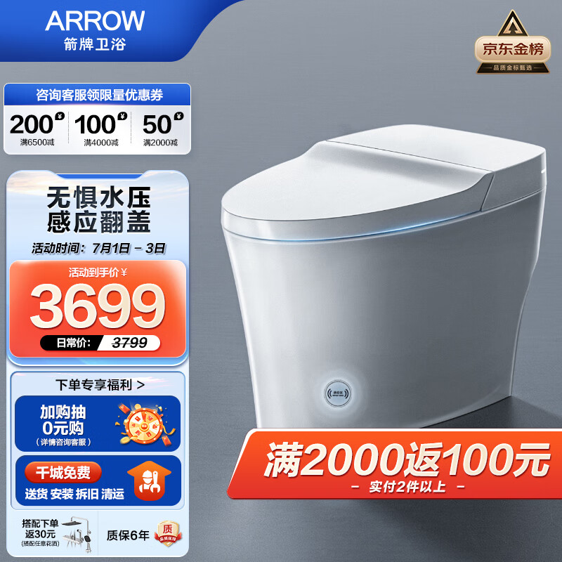 箭牌(ARROW)智能马桶恒温座圈按摩加热坐便器 无水压脚感翻盖翻圈AKE1135M价格:4499.00元!