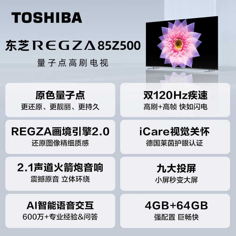 东芝电视85Z500MF 85英寸量子点120Hz高刷客厅巨幕【包安装版】液晶平板游戏电视机4+64GB价格:6298.00元!