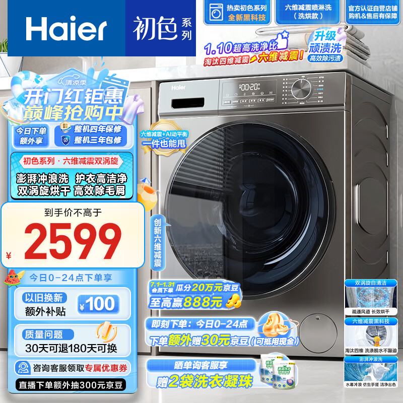 海尔(Haier)滚筒洗衣机全自动 初色系列 洗烘一体机 内衣洗 10公斤以旧换新 超薄家用带烘干 EG100H39S价格:2599.00元!