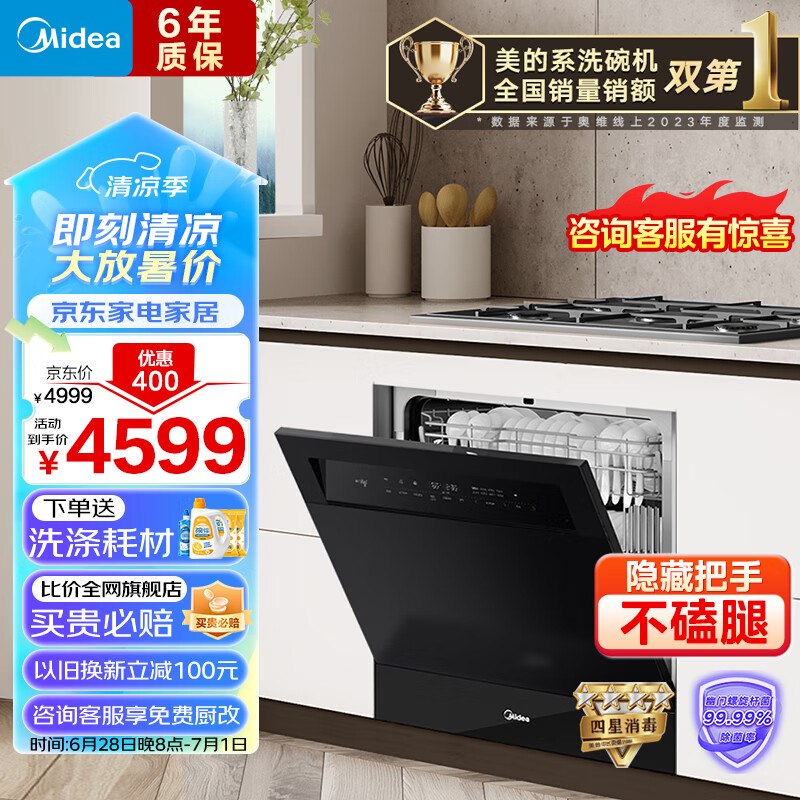 美的(Midea)洗碗机嵌入式台式家用灶下13套105℃热风烘干一级水效一键单消毒四星消毒变频节能V9价格:4599.00元!