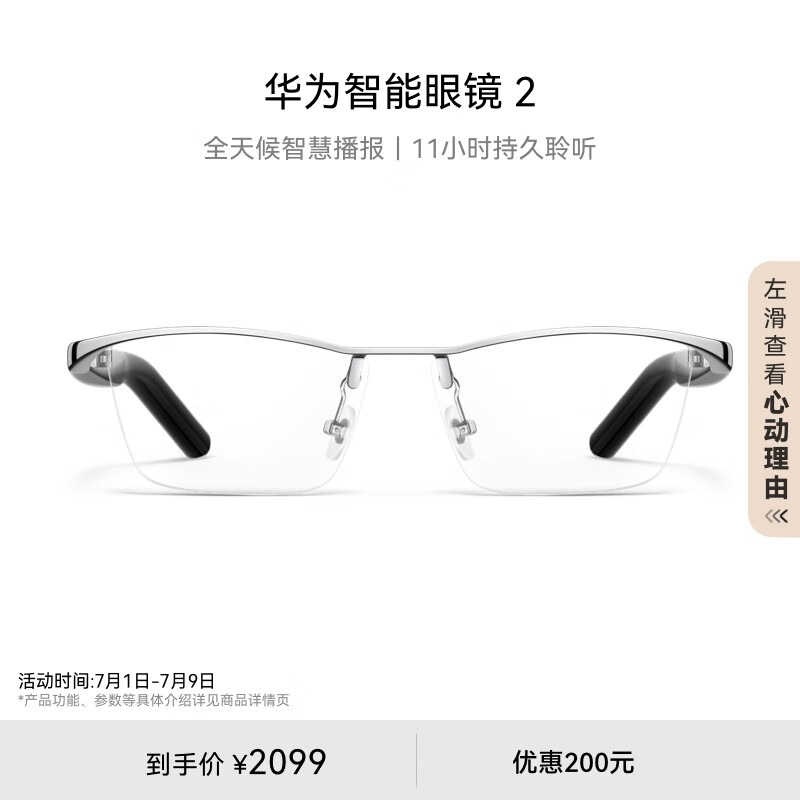 华为耳机 智能眼镜 2 开放式耳机 钛空光学镜 无线双耳立体声/手势控制/长续航价格:2077.00元!