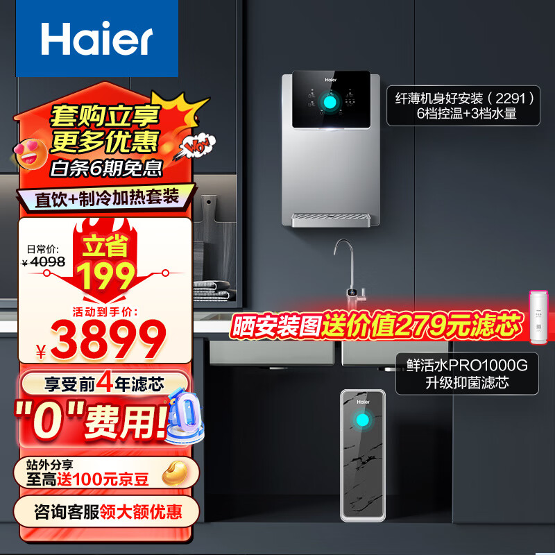 海尔(Haier)直饮加热净水器1000G鲜活水 pro5年RO反渗透厨下2.93L/分钟净水器+管线机HKC2400-R791D2U1+R2291价格:3899.00元!