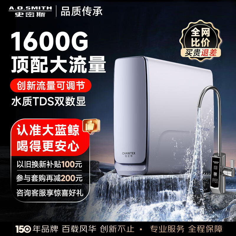 史密斯(A.O.SMITH)佳尼特净水器蓝鲸4000家用厨下式直饮净水机反渗透4升/分钟顶配大流量 1600G CR4000AB1价格:4699.00元!