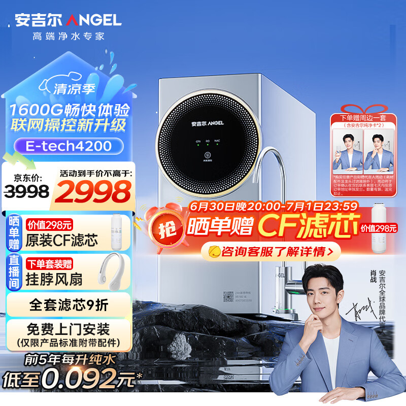安吉尔【肖战代言】E-Tech4200 家用净水器1600G流速体验 5年RO反渗透厨下直饮机 澎湃出水4.24L/min价格:2998.00元!