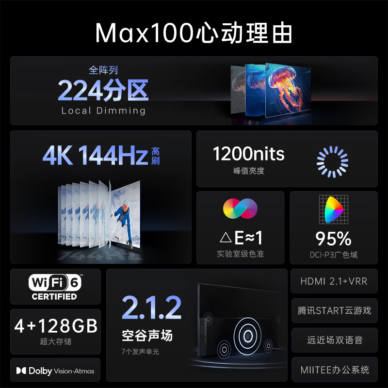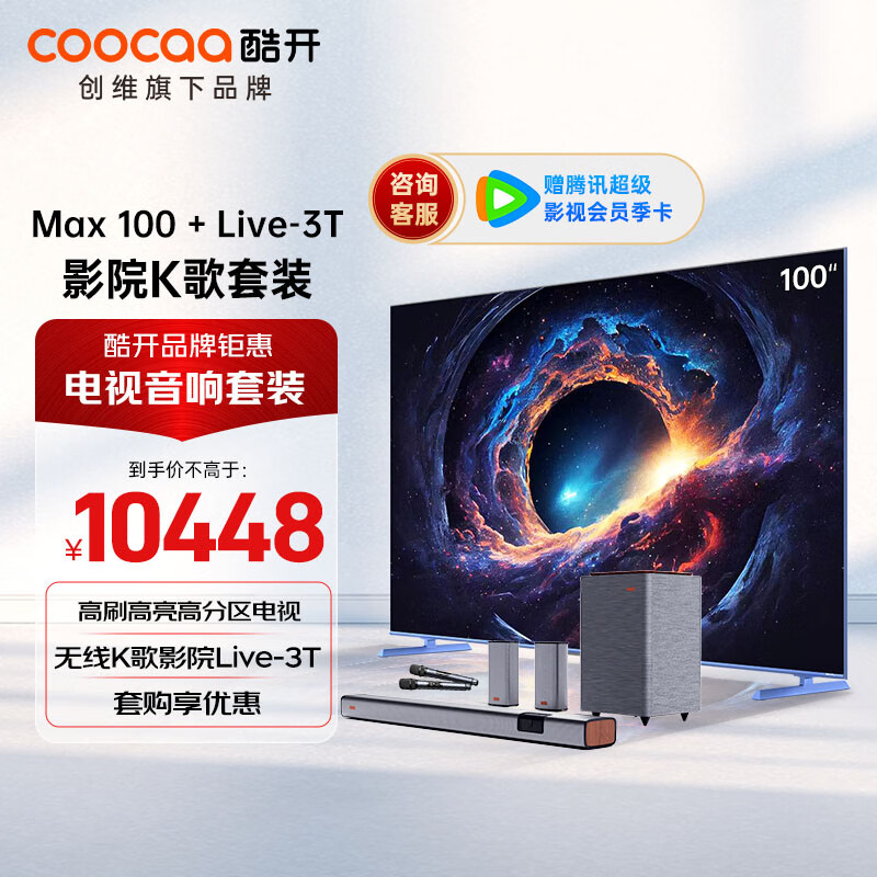 酷开创维Max100 100英寸电视 高刷高亮高分区电视机+无线K歌影院Live-3T 家庭KTV环绕音响 回音壁套装价格:10448.00元!