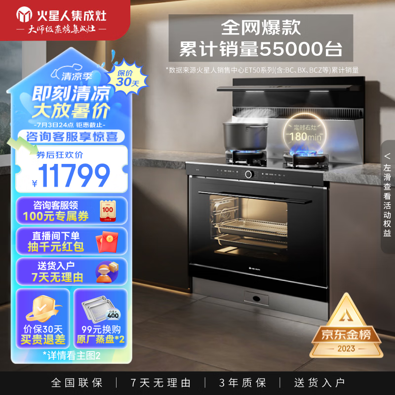 火星人集成灶 ET50BC Pro【门店同款】 集成灶一体式 变频22风量大吸力抽油烟机 4.5kW燃气灶液化气价格:11899.00元!