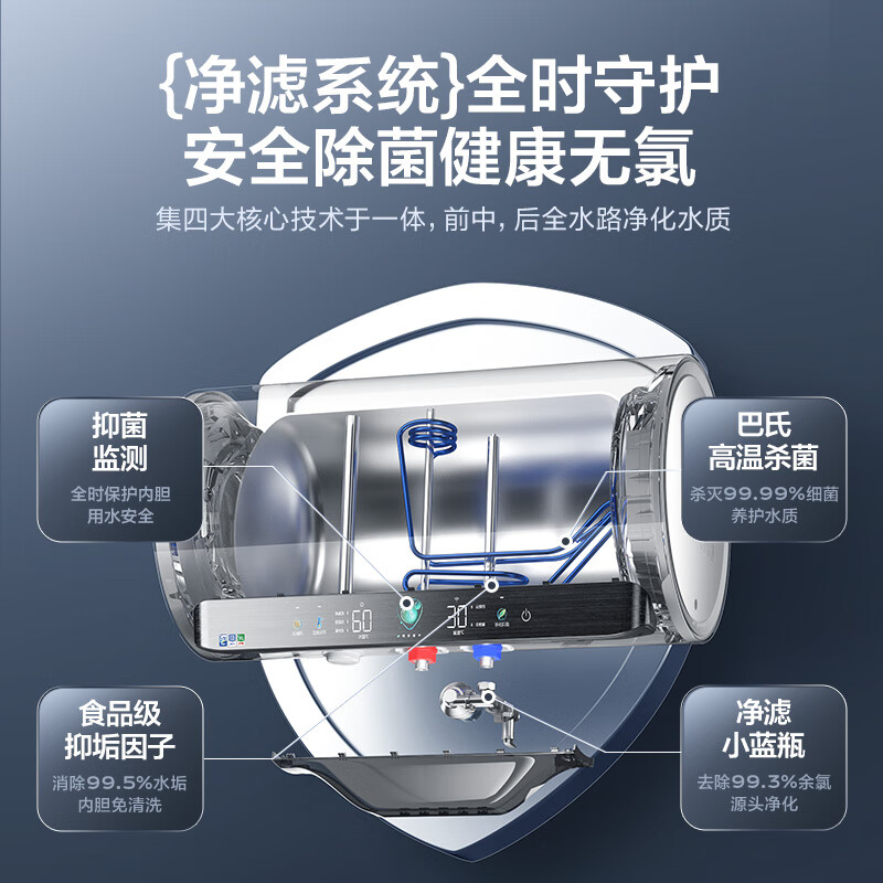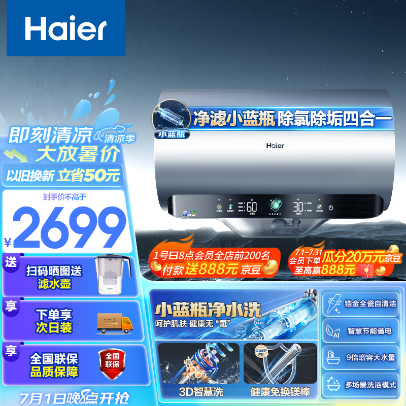 海尔(Haier)80升【3D小蓝瓶】净水洗瓷净瞬热美肤电热水器 家用储水式3300W速热大水量 EC8005-JE7U1 以旧换新价格:2899.00元!