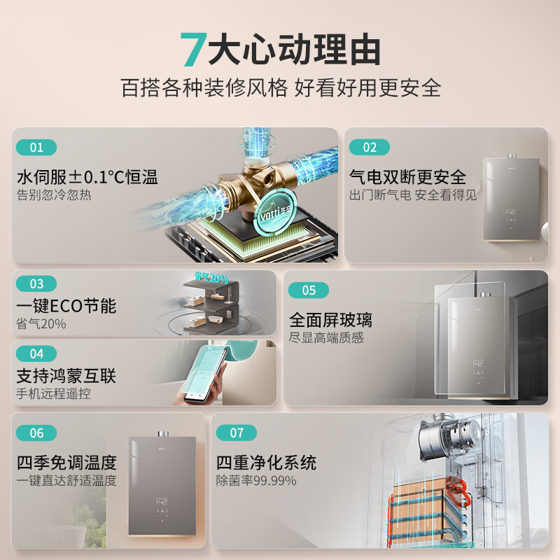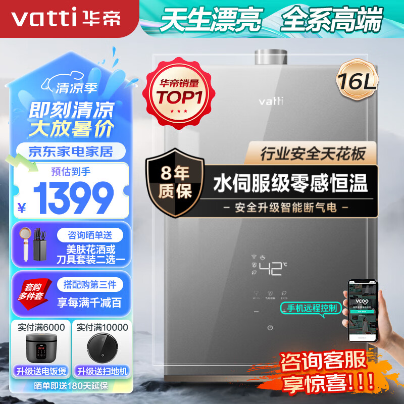 华帝(VATTI)16升燃气热水器天然气水伺服级恒温玻璃屏ECO节能省气智能wifi 气电双断 i12152-16 以旧换新价格:1499.00元!