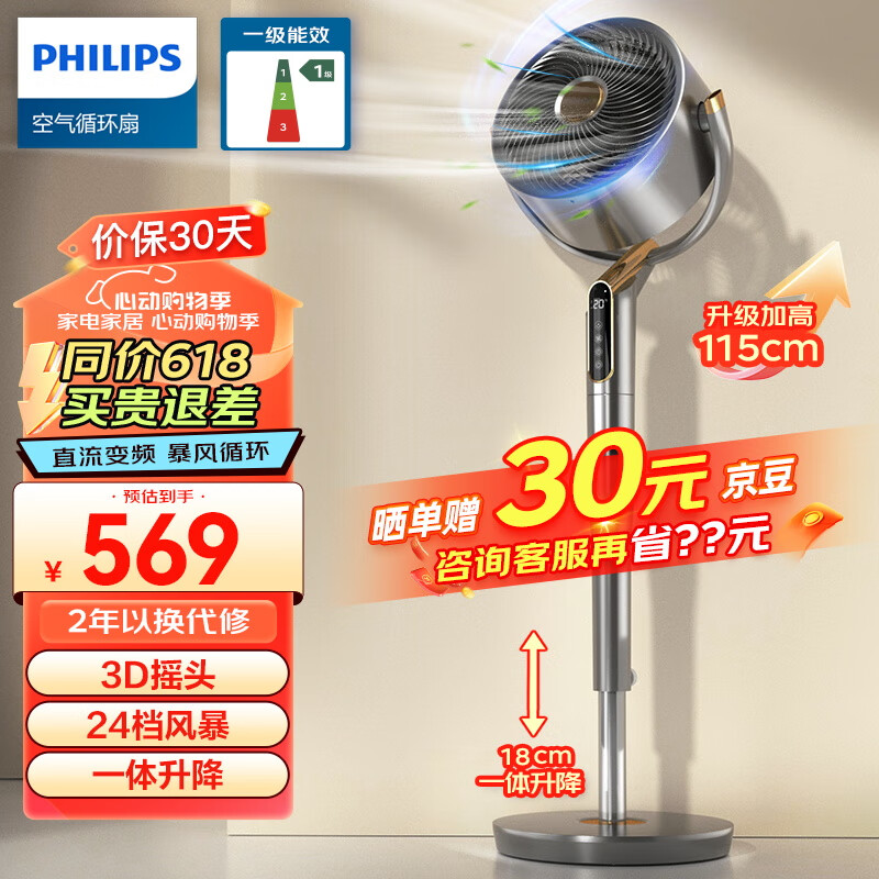 飞利浦(PHILIPS)空气循环扇电风扇落地扇家用直流变频一体升降3D自动摇头轻音节能遥控电扇 ACR4242CFD价格:854.00元!
