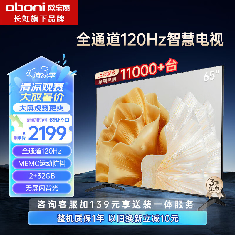 长虹欧宝丽65Z60 65英寸全通道120Hz高刷游戏电视 七大高刷场景 2+32GB 智能平板液晶电视机 以旧换新价格:2199.00元!