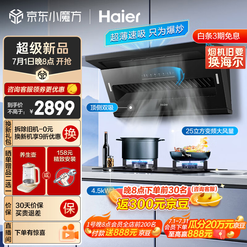 海尔(Haier)抽油烟机 顶侧双吸烟灶套装 变频25m3/min大吸力 挥手智控 家用油烟机燃气灶具套装C61+Q2BE2液价格:2899.00元!