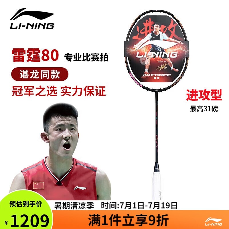 李宁(LI-NING)羽毛球拍谌龙同款全碳素单拍雷霆80专业大赛级球拍 3U空拍价格:1344.00元!