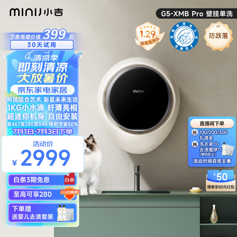 小吉(MINIJ)全自动母婴专洗直驱变频 防跌落 迷你机身1kg智能壁挂洗衣机 小水滴 G5-XMB pro价格:2999.00元!