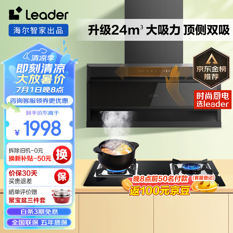 海尔(Haier)智家出品 顶侧双吸抽油烟机灶具套装 leader 24m3/min大吸力 挥手智控 5.2kw大火力IQ92D+L2C价格:1998.00元!