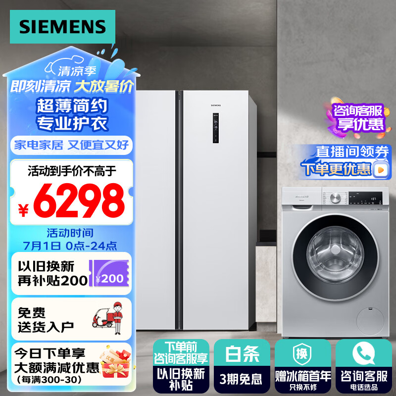 西门子(SIEMENS)冰洗套装502L超薄嵌入对开门冰箱+10kg除渍洗KA50NE20TI+WG52A108AW价格:6988.00元!