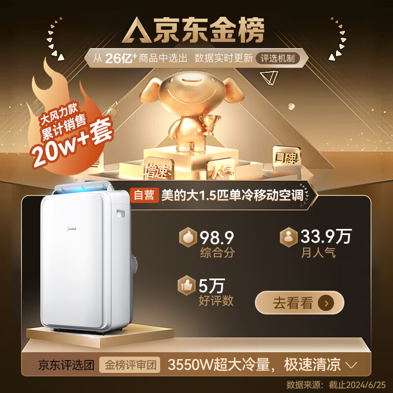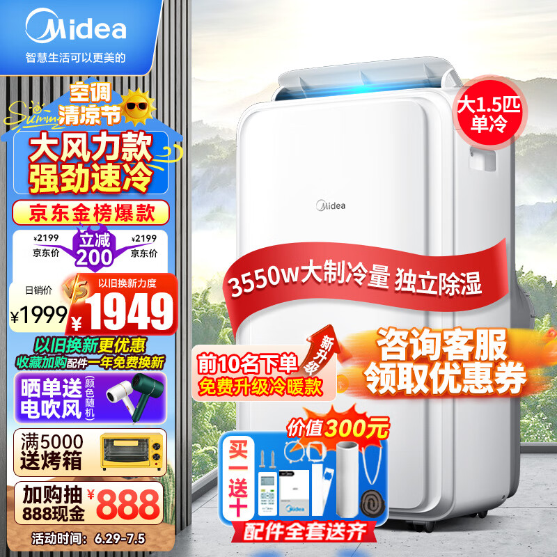 美的(Midea)移动空调大1.5匹单冷 一体机空调无外机免安装 家用厨房办公便捷立式空调 KY-35/N1Y-PD3价格:1999.00元!