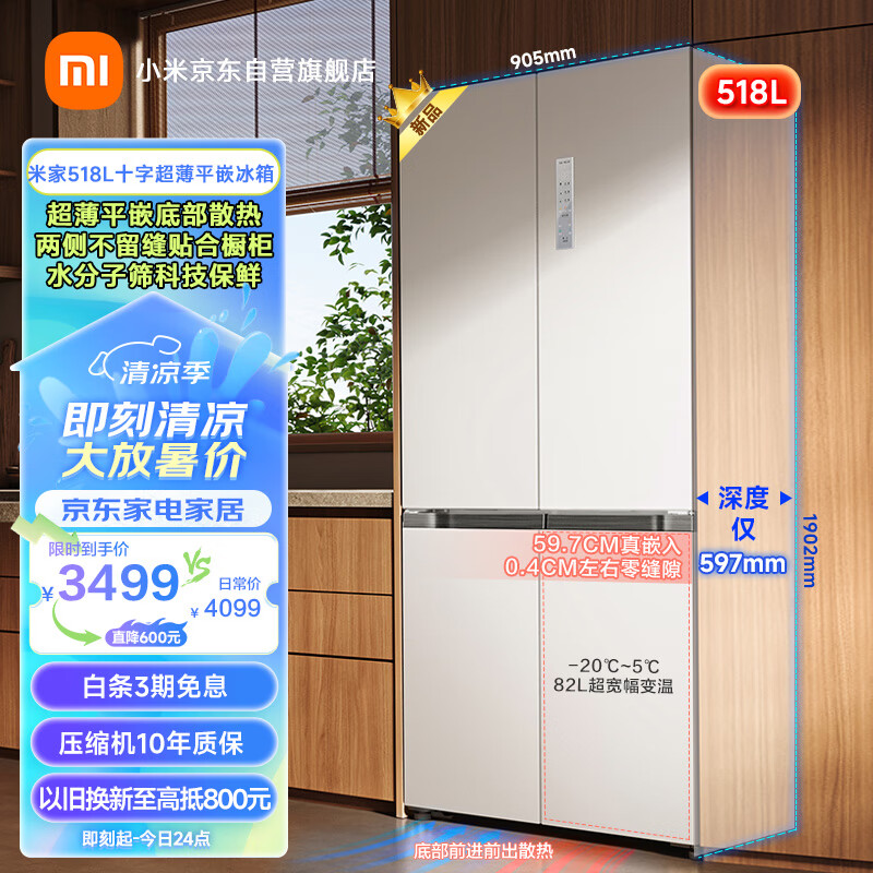 米家小米518升十字对开双开四开门家用电冰箱 597mm超薄平嵌底部前置散热小米澎湃智联BCD-518WMBI价格:3499.00元!