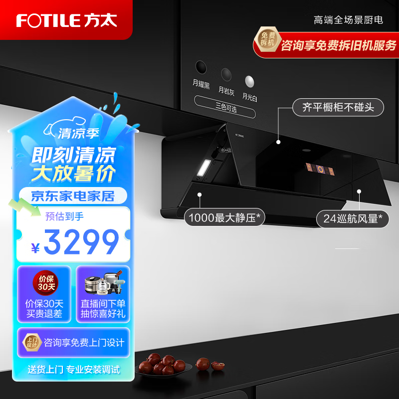方太(FOTILE)抽吸油烟机 侧吸式家用厨房油烟机 24巡航风量 挥手智控 方太新月系列 月耀黑 01-F1A价格:3299.00元!