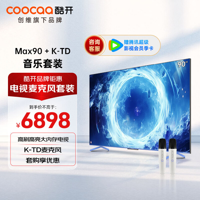 酷开创维 90英寸高刷高亮高分区电视机Max90+K-TD双支麦克风套装 K歌电视 家庭KTV无线话筒唱歌会议价格:6898.00元!