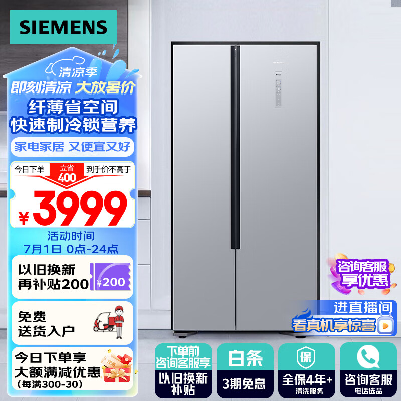 西门子(SIEMENS)500升对开门冰箱双开门变频无霜冰箱大容量家用超薄嵌入式银色以旧换新KX50NA41TI价格:4419.00元!
