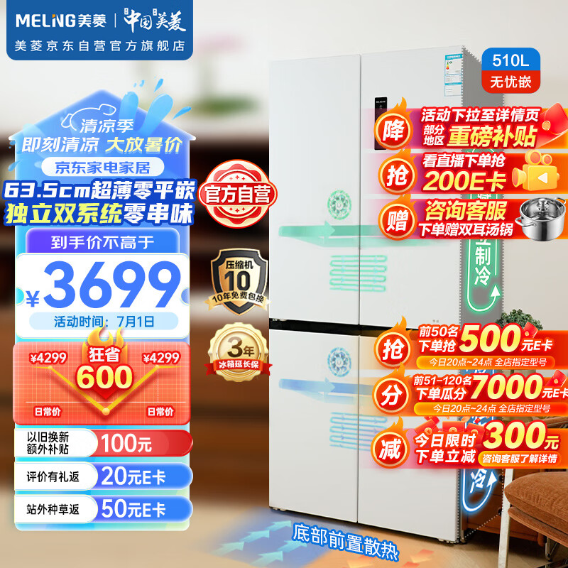 美菱(MeiLing)510升十字双开对开四开门超薄零嵌入式冰箱【李佳琦直播升级款】双系统双循环BCD-510WP9CZX白色价格:3999.00元!