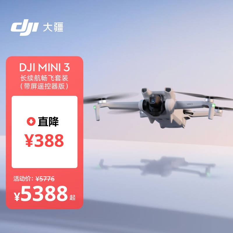 大疆 DJI Mini 3 长续航畅飞套装(带屏遥控器版)优选迷你航拍机 高清拍摄小型遥控飞机 大疆无人机价格:5388.00元!