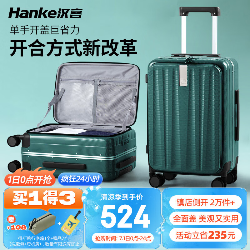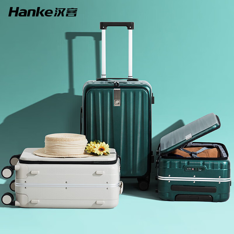 汉客行李箱男拉杆箱女旅行箱69升大容量24英寸墨绿色镇店前侧开盖铝框价格:759.00元!