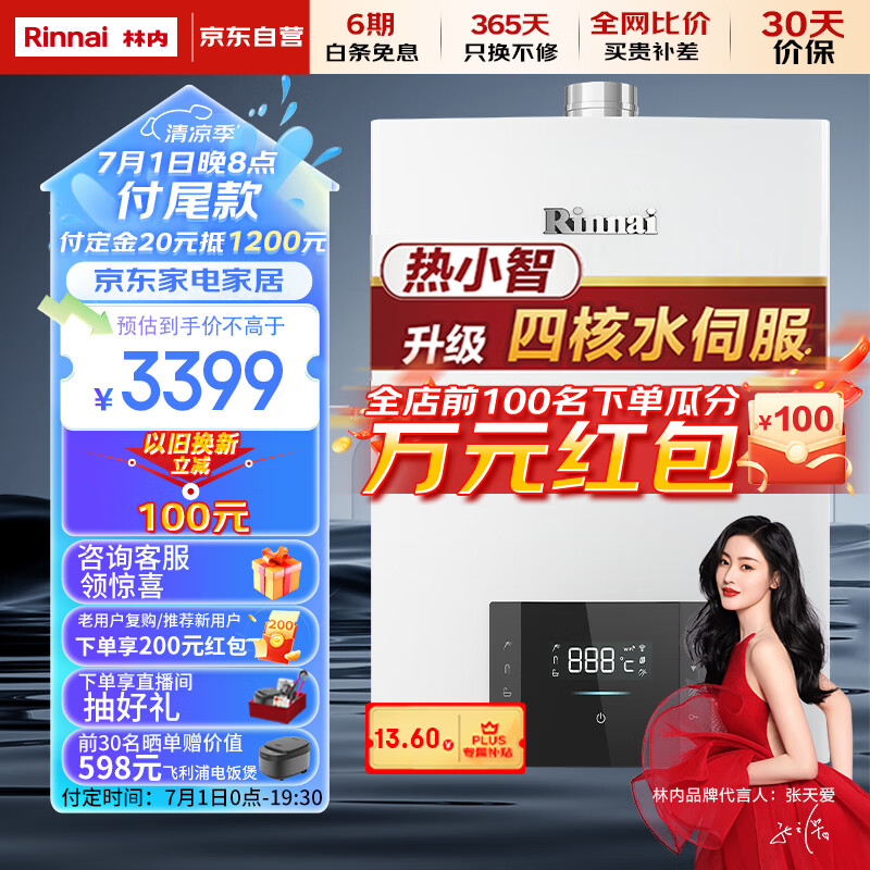 林内(Rinnai)【热小智】13升恒温燃气热水器变频水伺服京东小家智能生态APP智控13QD06W (JSQ26-D06W)以旧换新价格:3399.00元!