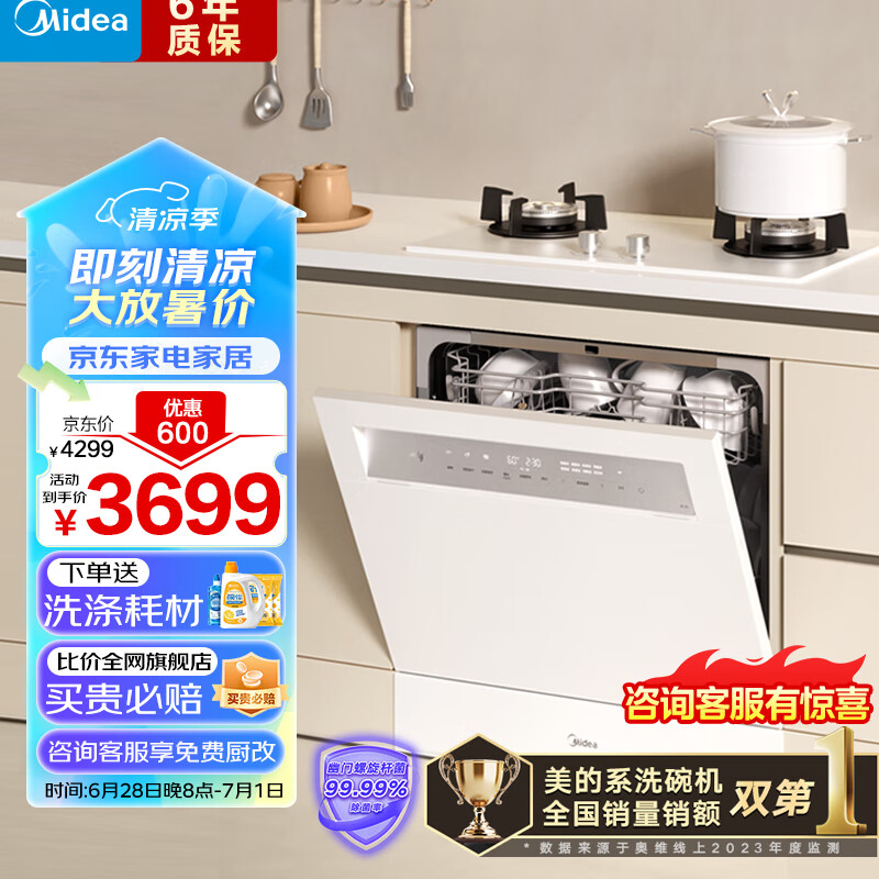 美的(Midea)洗碗机嵌入式台式 10套 家用灶下安装 变频节能 热风烘干 洗碗机一体机 V8(白)价格:3699.00元!