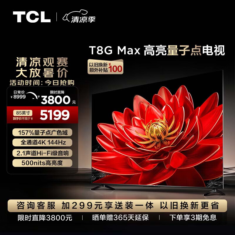 TCL电视 85T8G Max 85英寸 QLED量子点 4K 144Hz 2.1声道音响 4+64GB 客厅液晶智能平板游戏电视机价格:5199.00元!