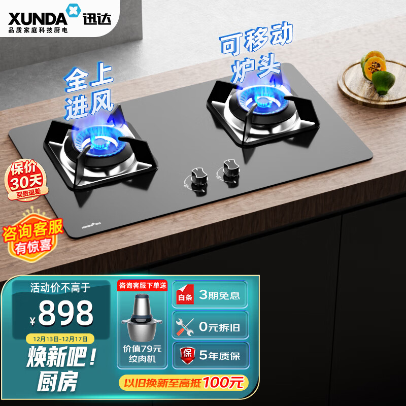 迅达(XUNDA)燃气灶液化气灶家用 煤气灶双灶具 嵌入式台式两用 4.1KW旋流猛火灶 可拆卸炉头 FJ2-液化气价格:998.00元!