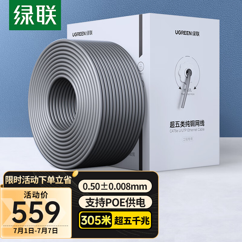绿联(UGREEN) 超五类千兆网线【0.50±0.008mm纯铜线芯】CAT5e千兆非屏蔽箱线 家装POE监控工程布线305米 60547价格:599.00元!
