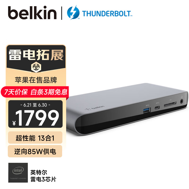 贝尔金(BELKIN)雷电3拓展坞 Intel认证 win/mac双系统 13合1 Type-C笔记本电脑拓展USB-C/DP/网口 充电器价格:1799.00元!