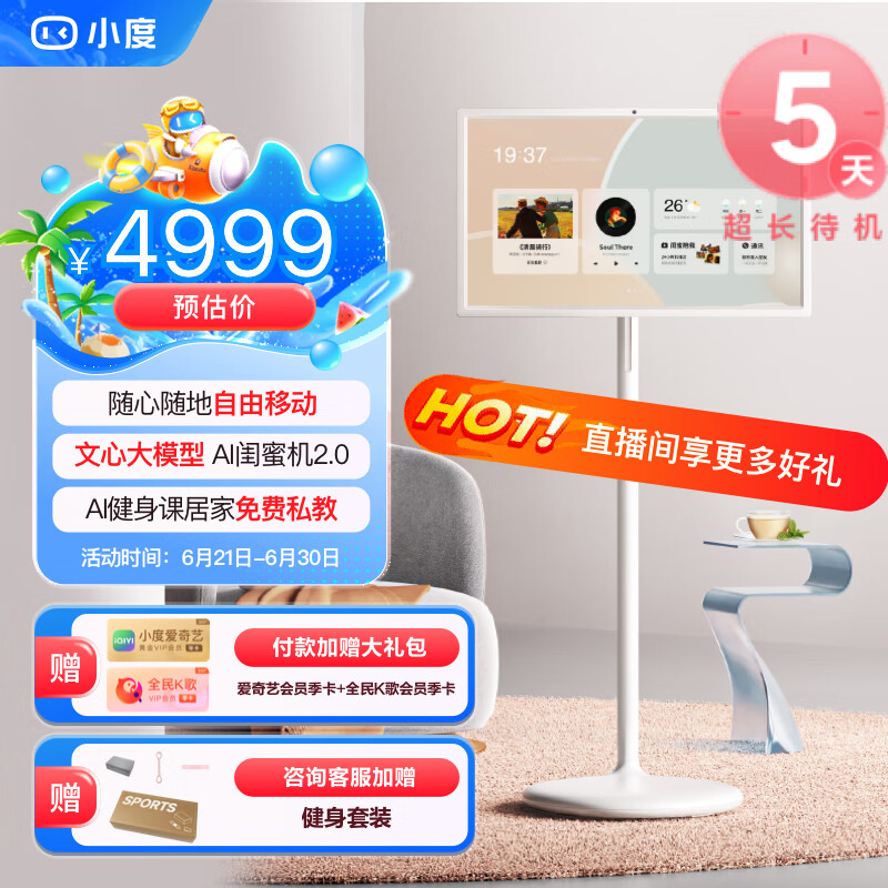 添添小度闺蜜机长续航版 智能平板 电视音响移动随心屏27英寸大屏触控显示器 追剧唱歌健身办公礼物价格:4999.00元!