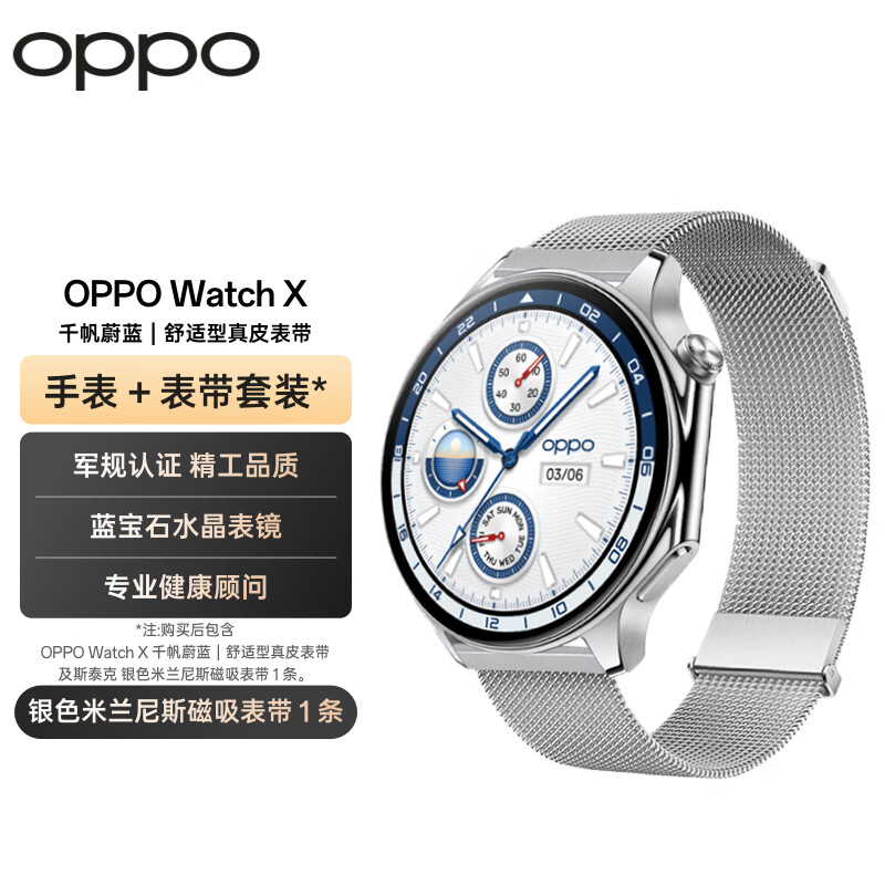 OPPO Watch X 千帆蔚蓝 全智能手表 运动健康手表 男女eSIM电话手表+银色米兰尼斯表带套装价格:2528.00元!