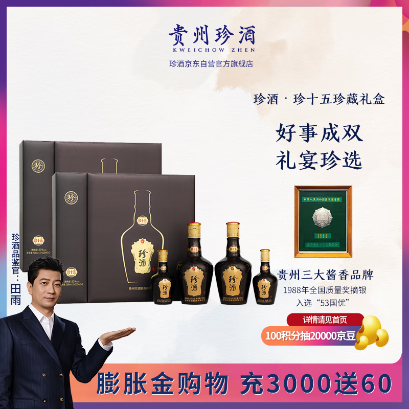 珍酒·珍十五(珍藏礼盒) 酱香型白酒 53度500ML*4+125ML*4整箱礼盒价格:2400.00元!