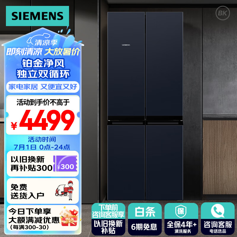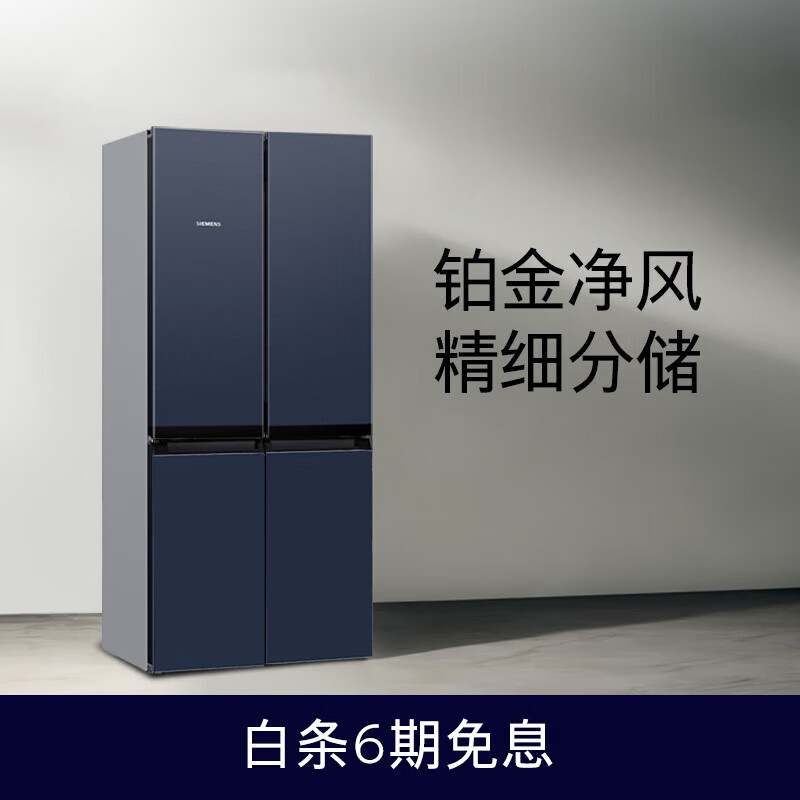西门子(SIEMENS) 481升混冷无霜双循环十字双开门四开门冰箱铂金净风除味清新湖蕴蓝以旧换新KM49EA56TI价格:4979.00元!