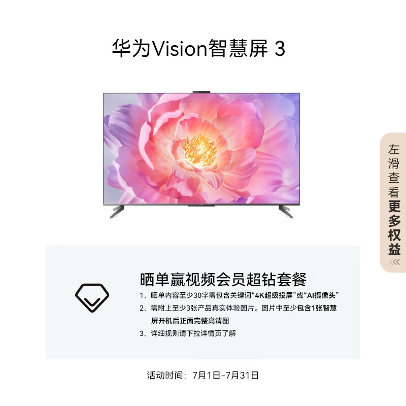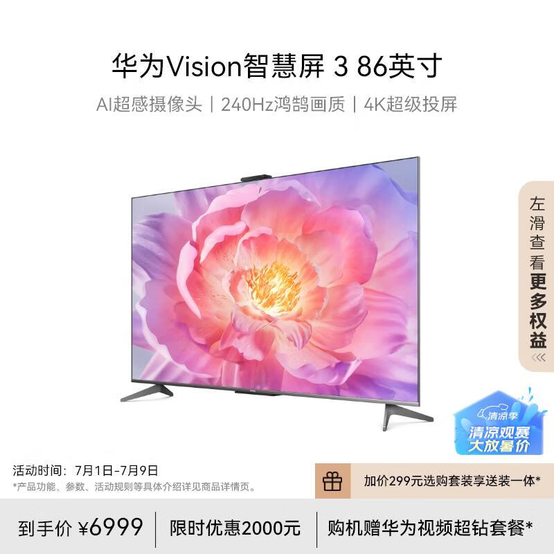 华为Vision智慧屏 3 86英寸 4K超级投屏 Pura 70投屏好搭档 AI摄像头 240Hz屏电视85寸HD86QINA价格:6999.00元!