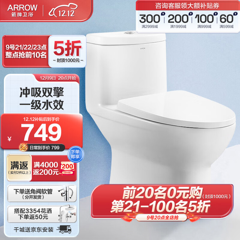 箭牌箭牌(ARROW)马桶家用卫浴虹吸连体坐便器座便 小户型卫生间坐厕 微晶釉面 1级水效AE1126T配置参数: