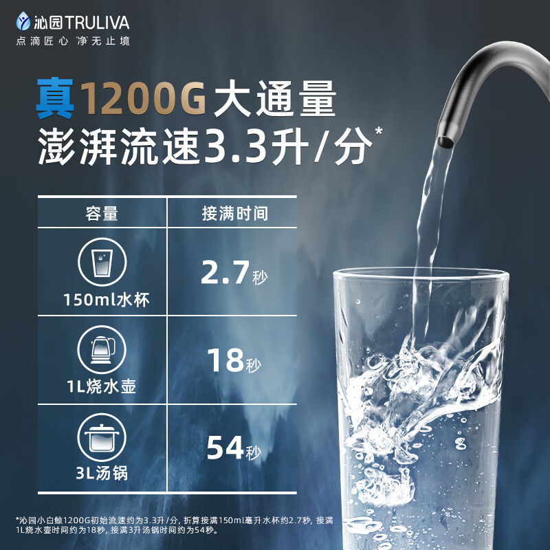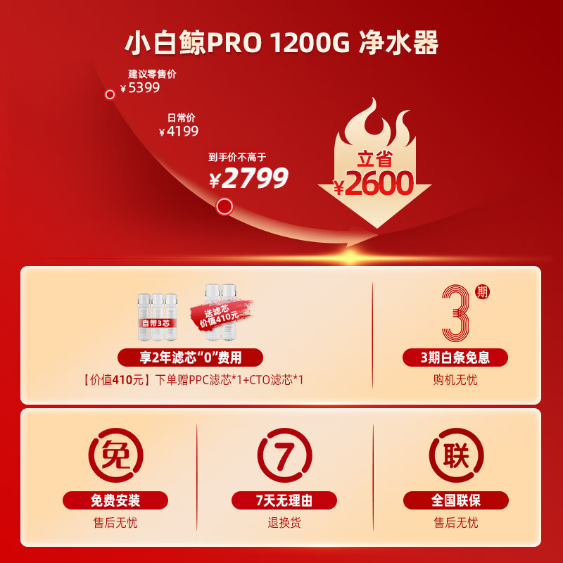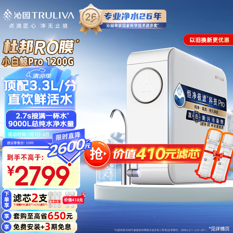 沁园(TRULIVA)小白鲸pro大通量1200G家用净水器5年RO反渗透厨下直饮3.3L/分钟 UR-S51246i价格:2799.00元!
