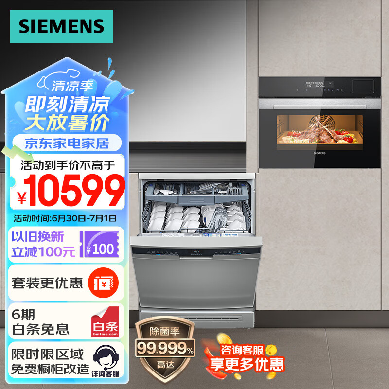 西门子(SIEMENS)洗嵌套装 16套大容量家用洗碗机 智能抽湿烘干+嵌入式蒸烤一体机组合套装 SJ23HI+CS389价格:10599.00元!