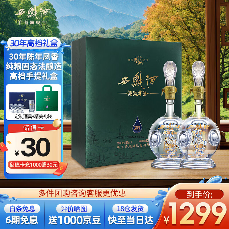 西凤酒 30年52度纯粮陈年凤香型白酒海窖龄婚庆喜宴请送礼盒装500mL*2价格:1299.00元!