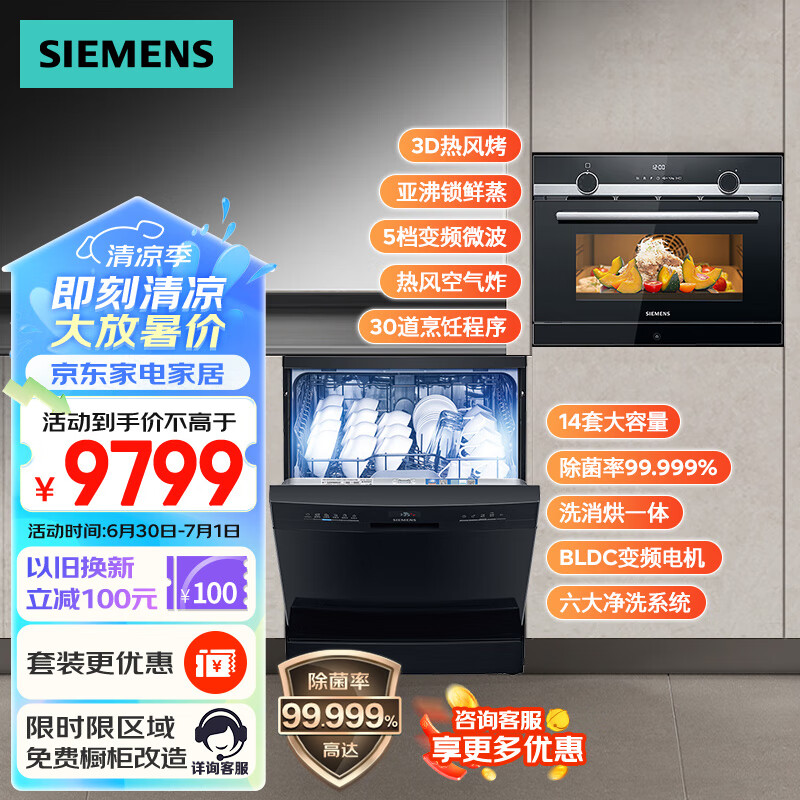 西门子洗嵌套装 14套大容量家用洗碗机+嵌入式微蒸烤炸一体机组合套装 SJ23HB66KC+CP565AGS1W价格:9799.00元!