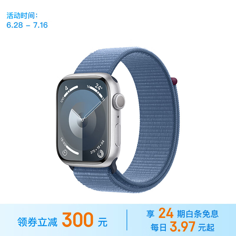 Apple【24期免息】Watch Series 9智能手表GPS款45毫米银色铝金属表壳凛蓝色回环表带MR9F3CH/A价格:3199.00元!