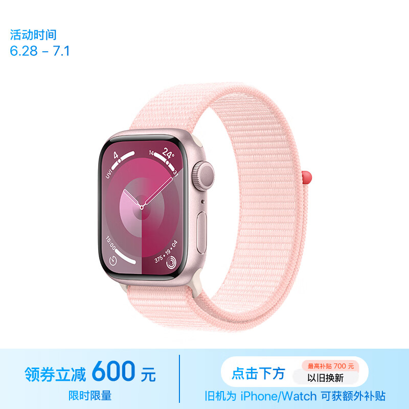 Apple/苹果 Watch Series 9 智能手表GPS款41毫米粉色铝金属表壳 亮粉色回环式运动表带 MR953CH/A价格:2999.00元!