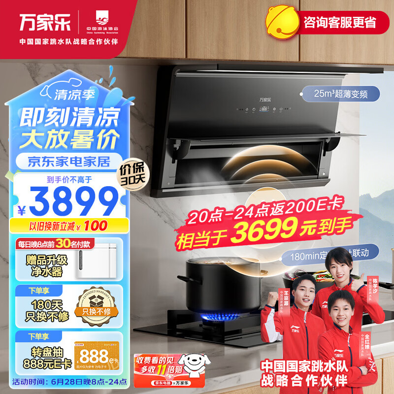 万家乐抽油烟机 烟灶联动定时套装 25立方变频巡航吸油烟机5.2kw定时灶 AI自清洗烟灶套装AH4+AY9天然气价格:3999.00元!